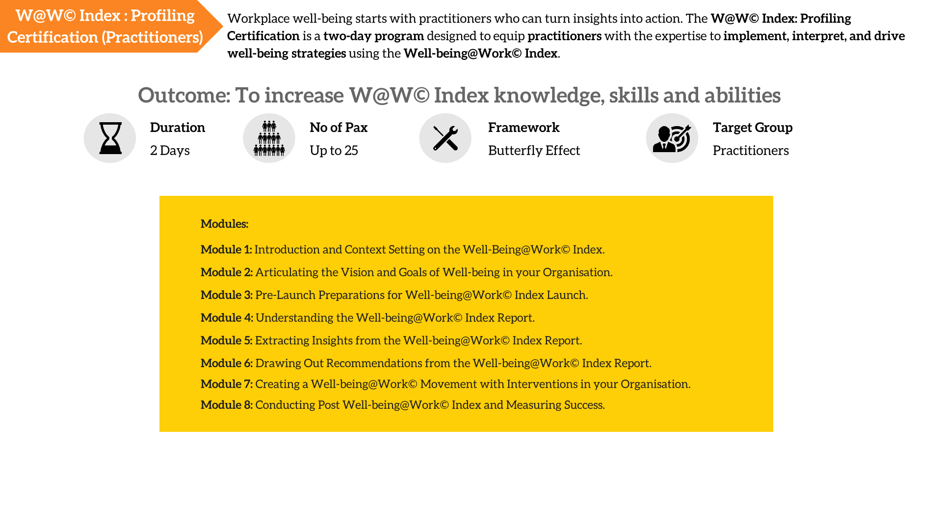 Workplace well-being starts with practitioners who can turn insights into action. The P@W© Index: Profiling Certification is a two-day program designed to equip practitioners with the expertise to implement, interpret, and drive well-being strategies using the People@Work© Index.