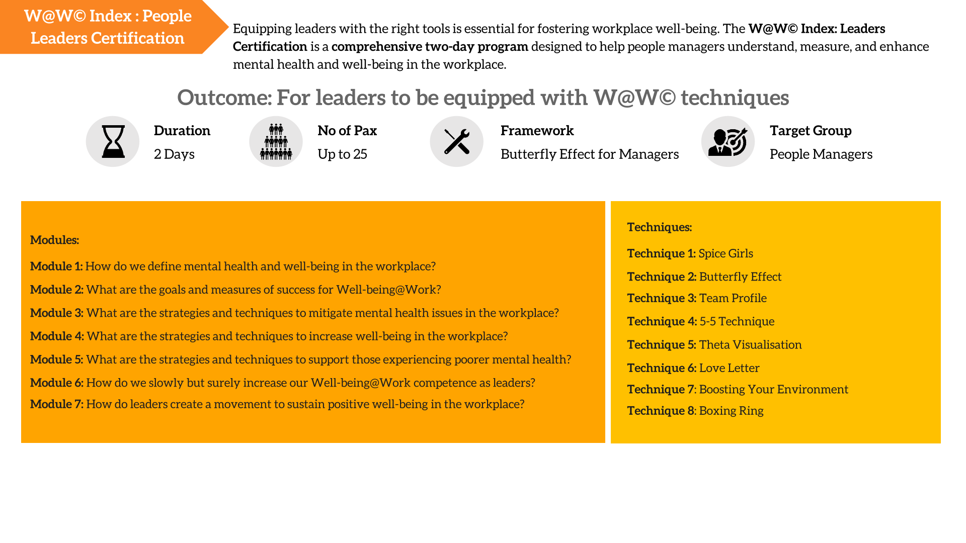 Equipping leaders with the right tools is essential for fostering workplace well-being. The P@W© Index: Leaders Certification is a comprehensive two-day program designed to help people managers understand, measure, and enhance mental health and well-being in the workplace.